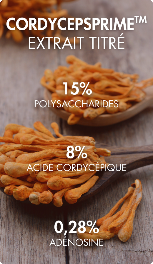 • CordycepsPrimeTM: Extrait déposé de mycélium de Cordyceps sinensis CS-4 naturel issu de fermentation, titré à 15% en polysaccharides, 8% en acide cordycépique, et 0,28% d’adénosine, à l’efficacité cliniquement démontrée
