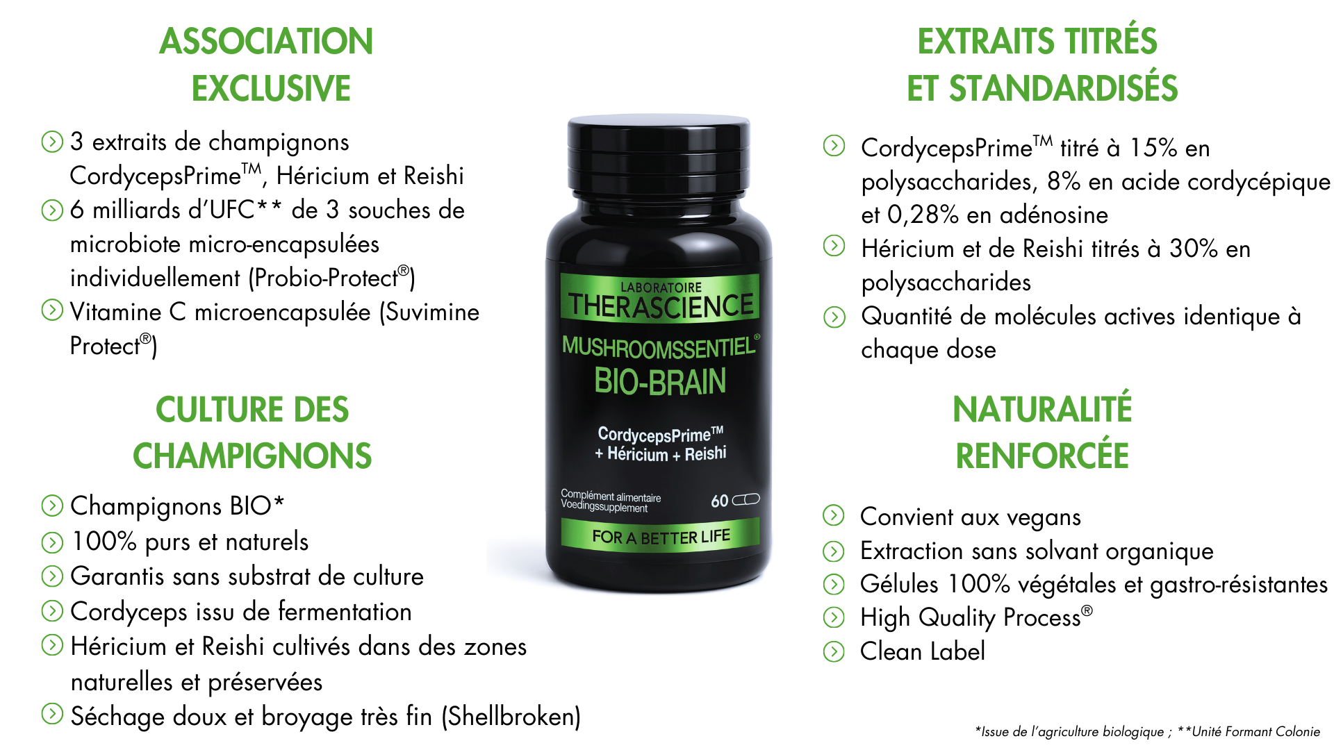 Ainsi, MUSHROOMSSENTIEL® Bio-Brain est une association fonctionnelle unique de champignons, de souches de microbiote et de vitamine C.