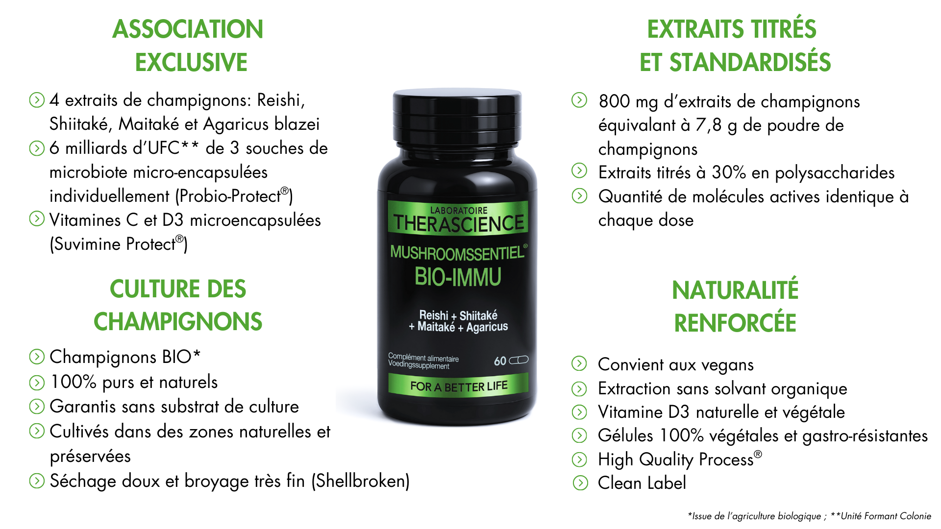 Notre formule MUSHROOMSSENTIEL® Bio-Immu  associe 4 extraits de champignons à l’action ciblée, avec 3 souches de microbiote (Lactobacillus rhamnosus GG, Bifidobacterium animalis lactis BS01 et Lactobacillus plantarum LP01) qui contribuent à l’équilibre de la flore intestinale.
