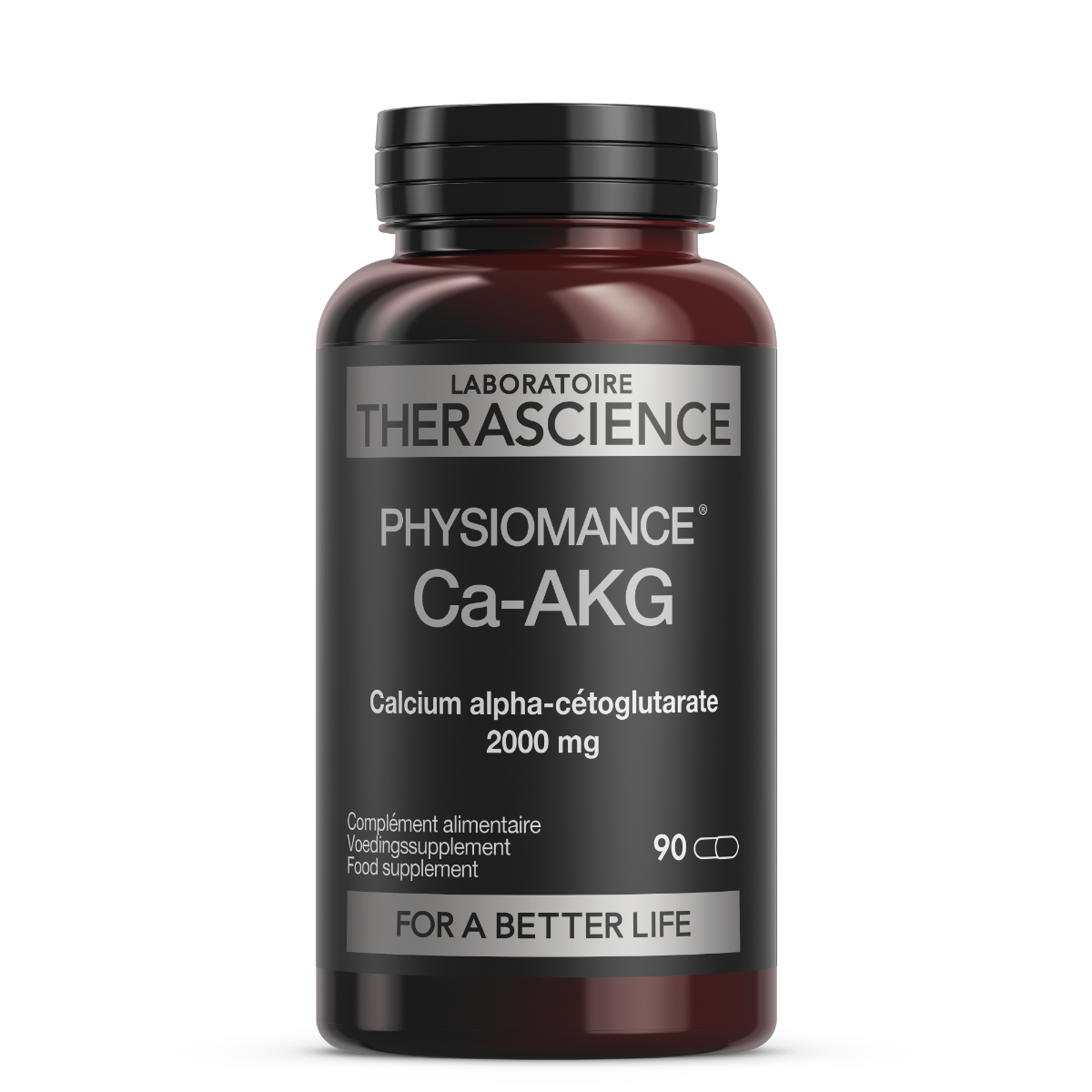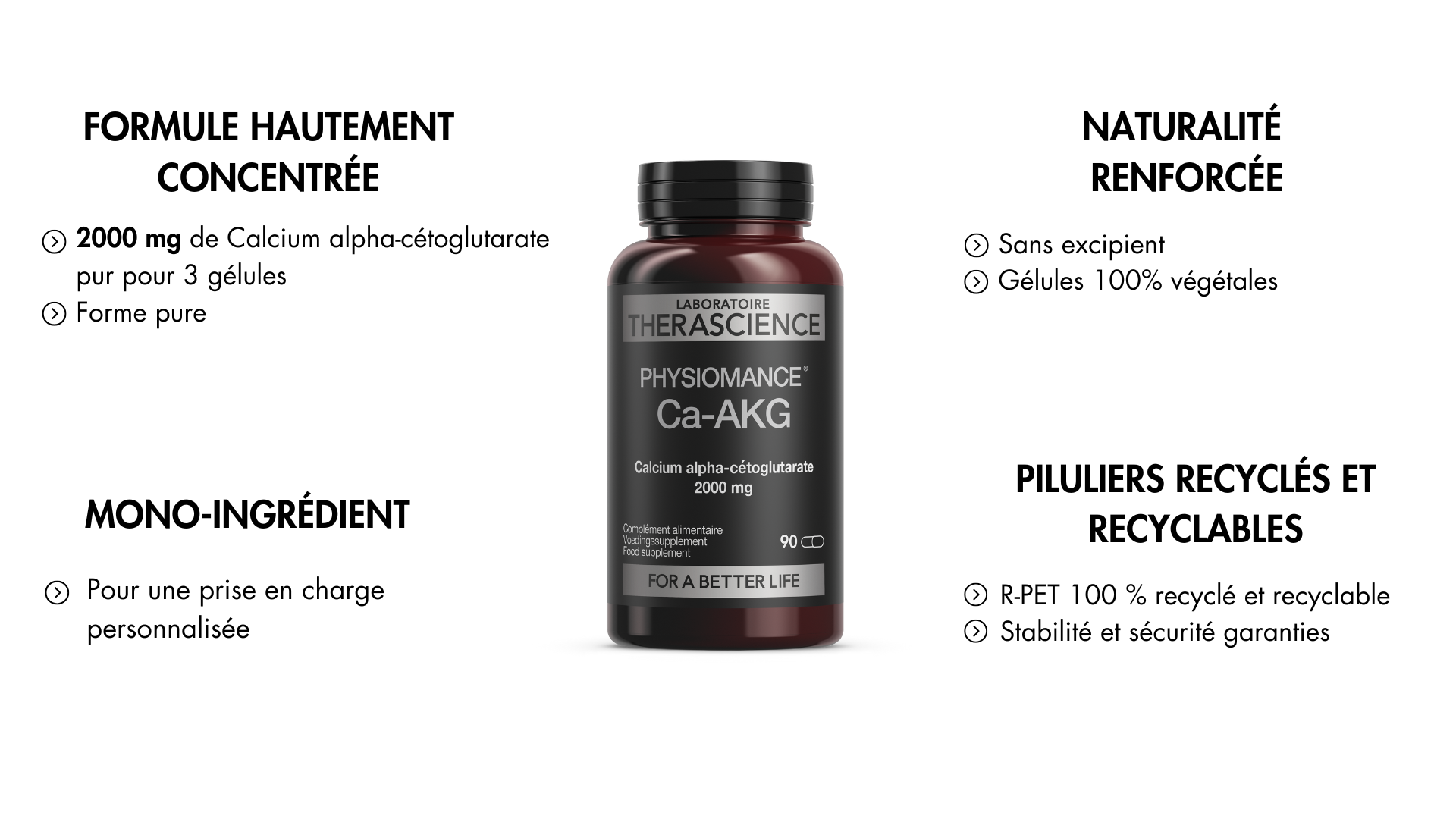 PHYSIOMANCE® Ca-AKG (Calcium Alpha-KetoGlutarate) est une formule hautement concentrée, avec 2 g de Calcium alpha-cétoglutarate par jour (3 gélules). Le Laboratoire Therascience a sélectionné une forme calcique de l’alpha-cétoglutarate (AKG) pour potentialiser les effets de l’alpha-cétoglutarate et du calcium. En tant que mono-ingrédient, ce complément alimentaire permet une prise en charge personnalisée. De plus, PHYSIOMANCE® Ca-AKG est sans excipient, et conditionné en gélules 100 % végétales.