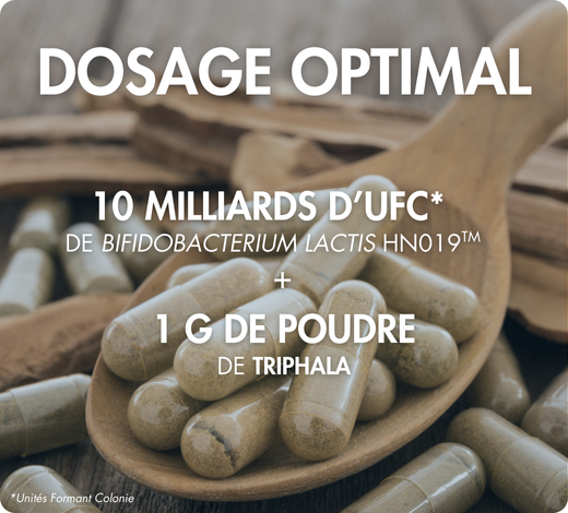 • Association synergique et innovante : Bifidobacterium lactis HN019 et de Triphala BIO* ;