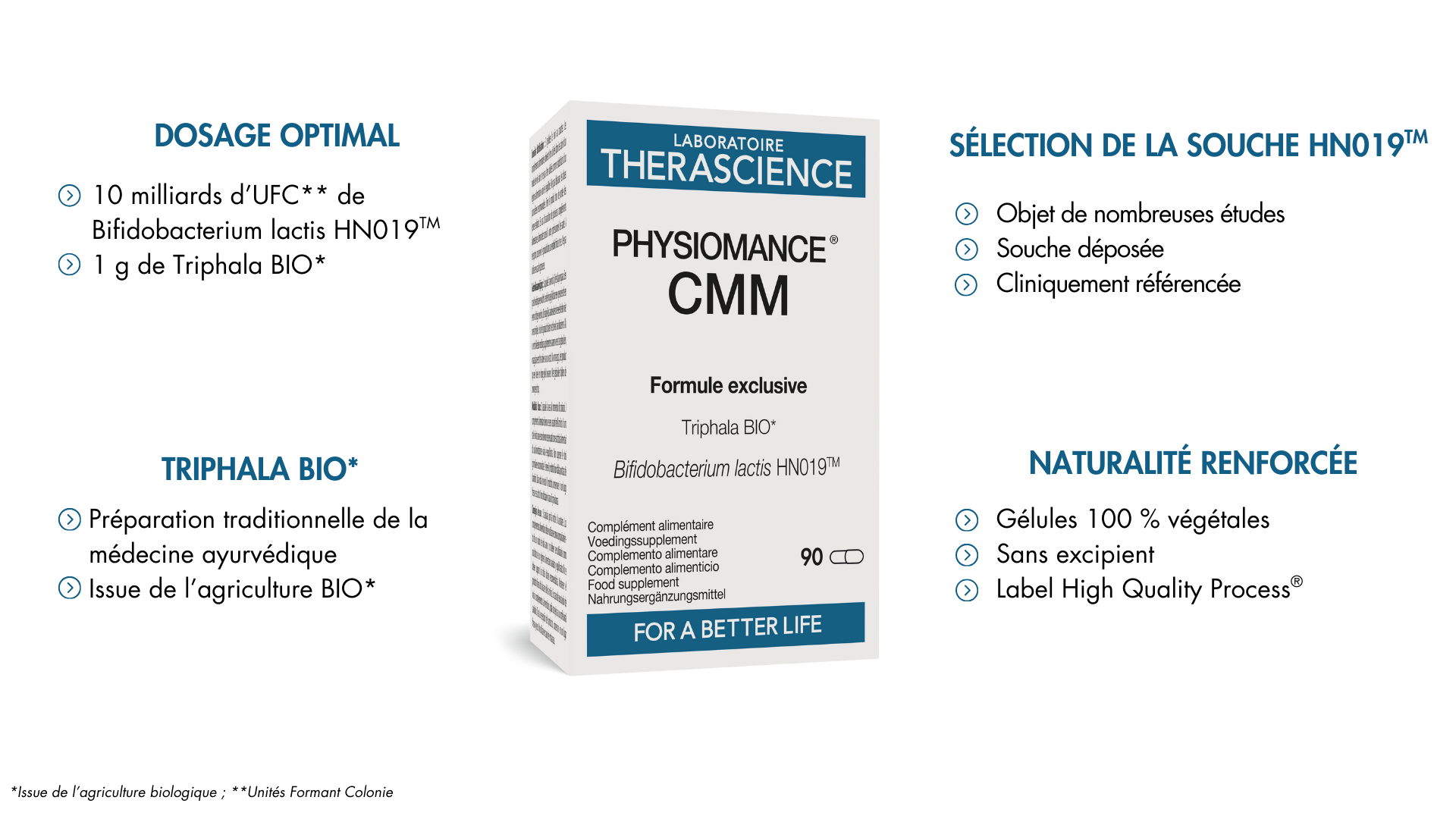 PHYSIOMANCE®CMM est une formule synergique et innovante associant la souche probiotique Bifidobacterium lactis HN019™, dosée à 10 milliards d’UFC**, à un extrait de Triphala BIO* titré à 1 g. La souche HN019™, cliniquement documentée pour sa contribution à l’équilibre de la flore intestinale avec un excellent profil de tolérance. Le Triphala BIO*, association traditionnelle ayurvédique de trois fruits — amla, bibhitaki et haritaki — est ici utilisé sous forme de poudre certifiée issue de l’agriculture biologique, sans excipient, pour une naturalité maximale. La formule bénéficie d’une biodisponibilité optimale grâce à ses gélules gastro-résistantes DR Caps™, 100 % végétales, permettant une protection des actifs.