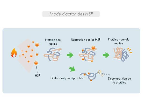 Les protéines de choc thermique (HSP) sont des protéines dites « chaperonnes », ce qui signifie que leur fonction est d’assister d’autres protéines dans leur maturation, en évitant la formation d‘agrégats qui les rendent non fonctionnelles. On sait en effet que pour fonctionner correctement, les protéines doivent être "repliées". Les HSP réparent les protéines non repliées ou favorisent leur décomposition si elles ne sont pas réparables.