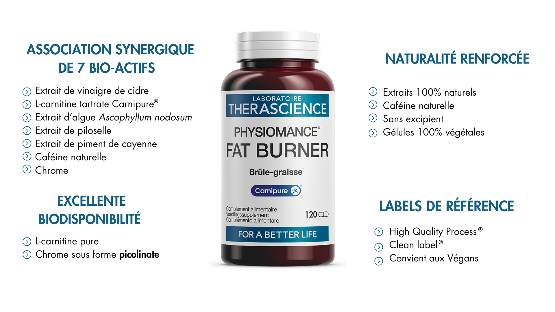 PHYSIOMANCE® Fat Burner repose sur des avancées scientifiques et des actifs reconnus pour leurs bienfaits sur l’organisme. Cette synergie d’ingrédients permet une action ciblée et complète :