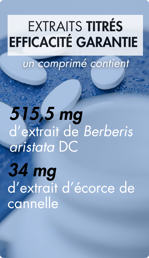 L’extrait de Berberis aristata DC est titré à 97% en berbérine, ce qui représente 500 mg de berbérine par dose journalière.