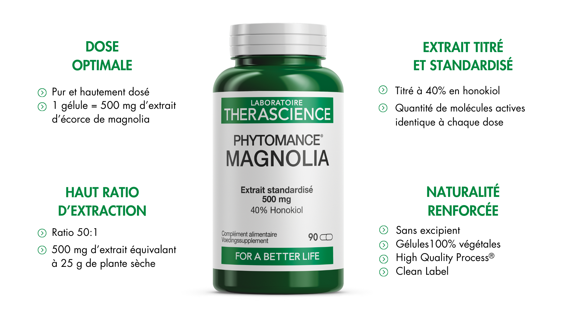 • Dose optimale : 500 mg d’extrait de Magnolia titré à 40% en honokiol par gélule