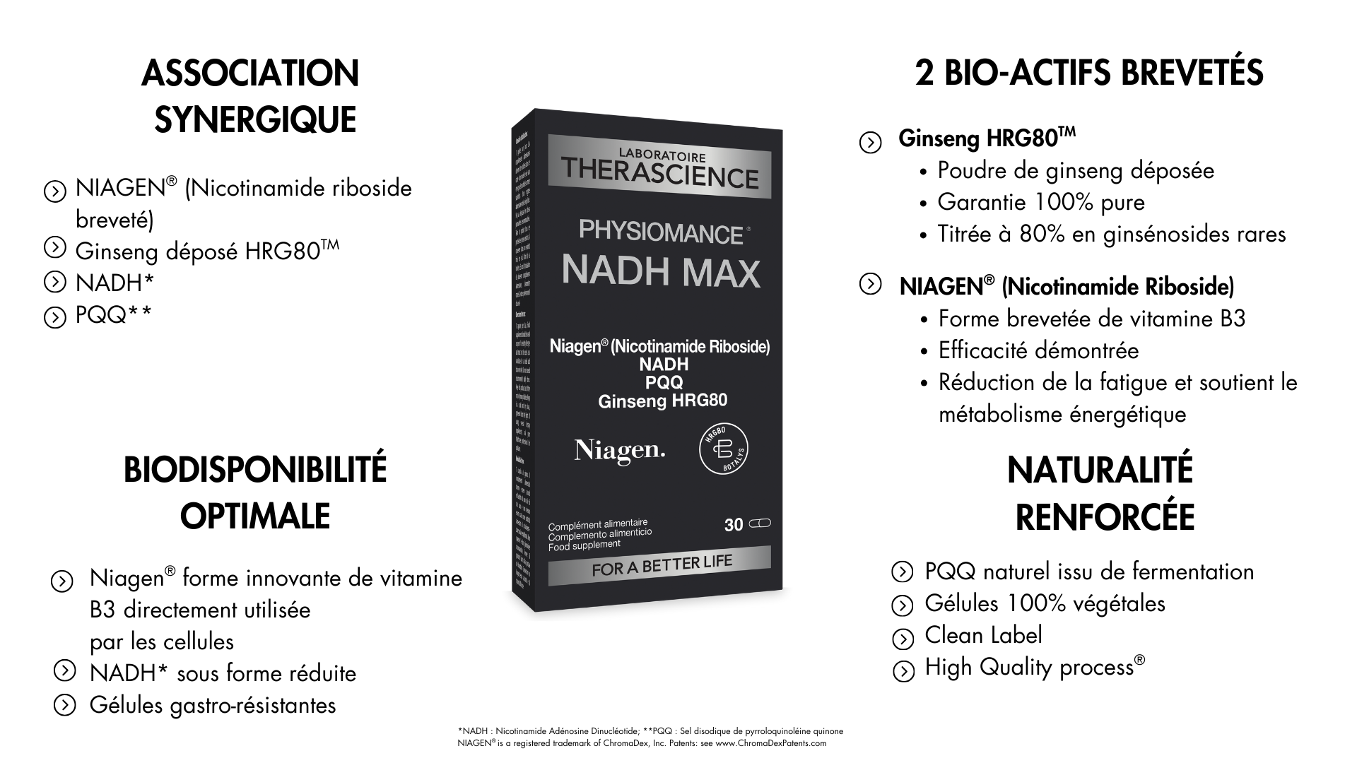• Association synergique : 2 bio-actifs brevetés, Niagen® et ginseng HRG80TM associés à du NADH* et de la PQQ**