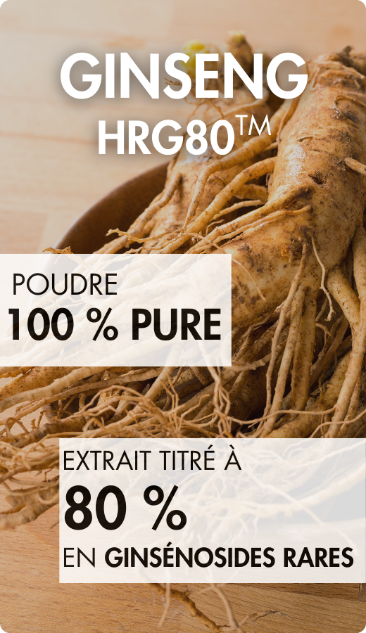 Le Laboratoire THERASCIENCE a sélectionné le ginseng HRG80™, une poudre de ginseng concentrée et rigoureusement standardisée afin de garantir une efficacité constante. Particularité majeure : cet extrait est titré en ginsénosides rares, des molécules reconnues pour leur activité biologique et généralement présentes en faible quantité dans les ginsengs classiques.