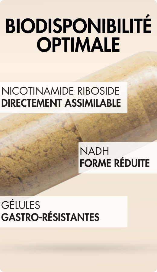 L’ensemble de la formule a été conçu pour offrir une biodisponibilité optimale. Elle intègre ainsi le Niagen®, une source directe de vitamine B3 facilement utilisée par les cellules, du NADH sous forme réduite, plus stable et immédiatement fonctionnel, ainsi que des gélules gastro-résistantes permettant une libération ciblée des actifs au niveau intestinal, facilitant leur absorption.