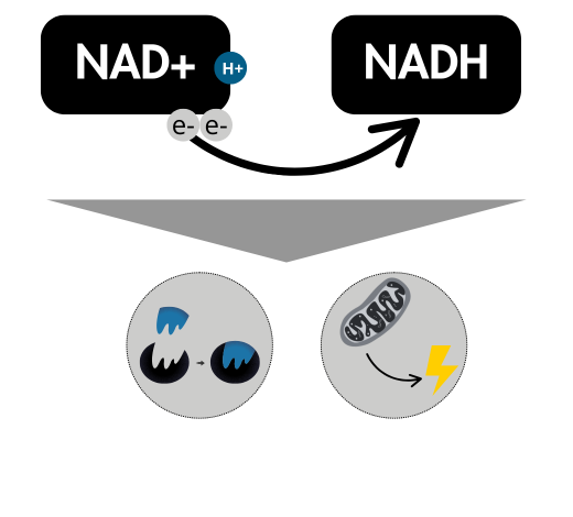 Le NADH fonctionne en étroite synergie avec le NAD⁺, sa forme oxydée. Ensemble, ils constituent un couple redox indispensable au fonctionnement cellulaire. Dans ce couple oxydant/réducteur, les deux formes d’une même molécule alternent entre perte et gain d’électrons afin de permettre les réactions biochimiques. L’oxydant capte les électrons, tandis que le réducteur les cède : ce cycle continu assure un équilibre dynamique fondamental pour le métabolisme cellulaire.