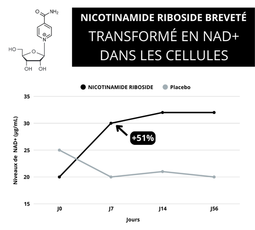 (Nicotinamide Riboside) : Nouvelle forme brevetée de vitamine B3 à l’efficacité démontrée sur sa capacité à augmenter efficacement les niveaux de NAD+ par synthèse endogène.