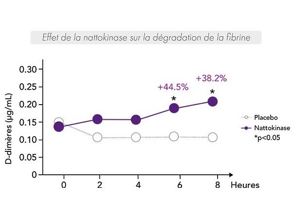 Une étude clinique, versus placebo réalisée auprès de 12 patients en bonne santé ayant reçu 1 seule dose de 2000 FU* de nattokinase, a montré une augmentation significative de la formation de D-dimères, marqueurs de la dégradation de la fibrine, après 6h et 8h (respectivement +44,5% et +38,2%)4.