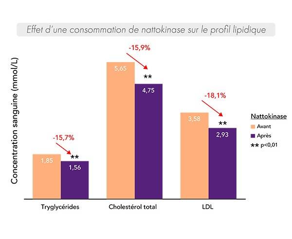 Une troisième étude rétrospective réalisée auprès de 1062 patients supplémentés quotidiennement avec 10 800 FU* de nattokinase, a montré une réduction significative des taux sanguins de triglycérides, de cholestérol total et de LDL après 12 mois de supplémentation8.