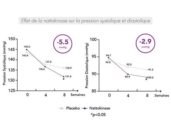 Une quatrième étude clinique, versus placebo, réalisée auprès de 86 patients, a montré une réduction significative de la pression systolique et de la pression diastolique après une supplémentation avec 2000 FU* de nattokinase pendant 2 mois9.