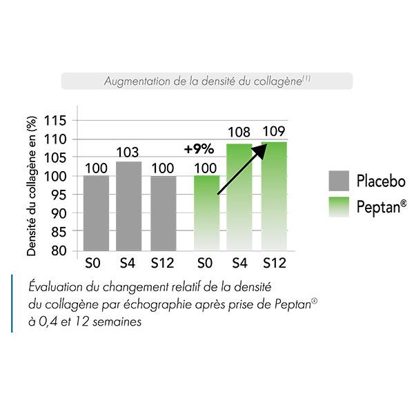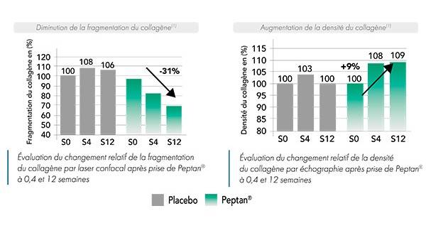 Les effets du Peptan® sur la peau et les signes de l’âge ont été prouvés1 : D’après une étude clinique, randomisée en double-aveugle versus placebo, réalisée sur 106 femmes âgées de 45 à 65 ans, on observe une diminution de 31% de la fragmentation du réseau de collagène et une augmentation de 9% de la densité du collagène après une supplémentation orale par 10 g de Peptan® pendant 12 semaines1.