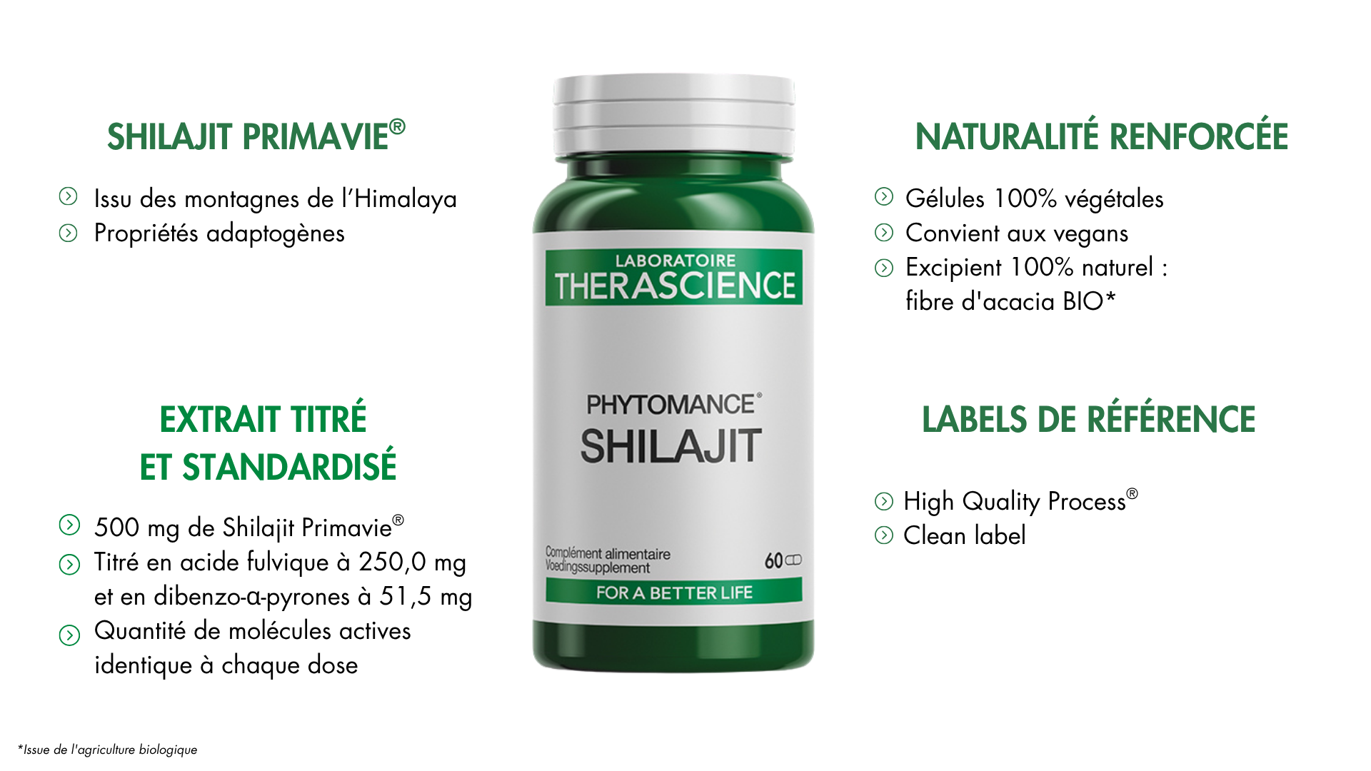 En choisissant PHYTOMANCE® SHILAJIT, le Laboratoire THERASCIENCE s’engage sur une qualité optimale, grâce à un ingrédient premium répondant aux standards scientifiques les plus exigeants.
