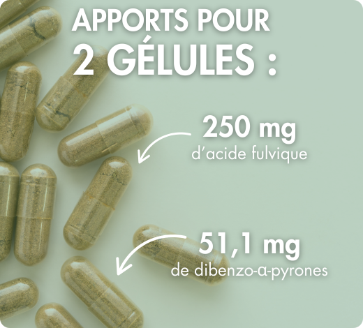 Pour 2 gélules, PHYTOMANCE® SHILAJIT fournit la dose de 500 mg de shilajit PrimaVie®, soit 250 mg d’acide fulvique et 51,5 mg de dibenzo-α-pyrones.