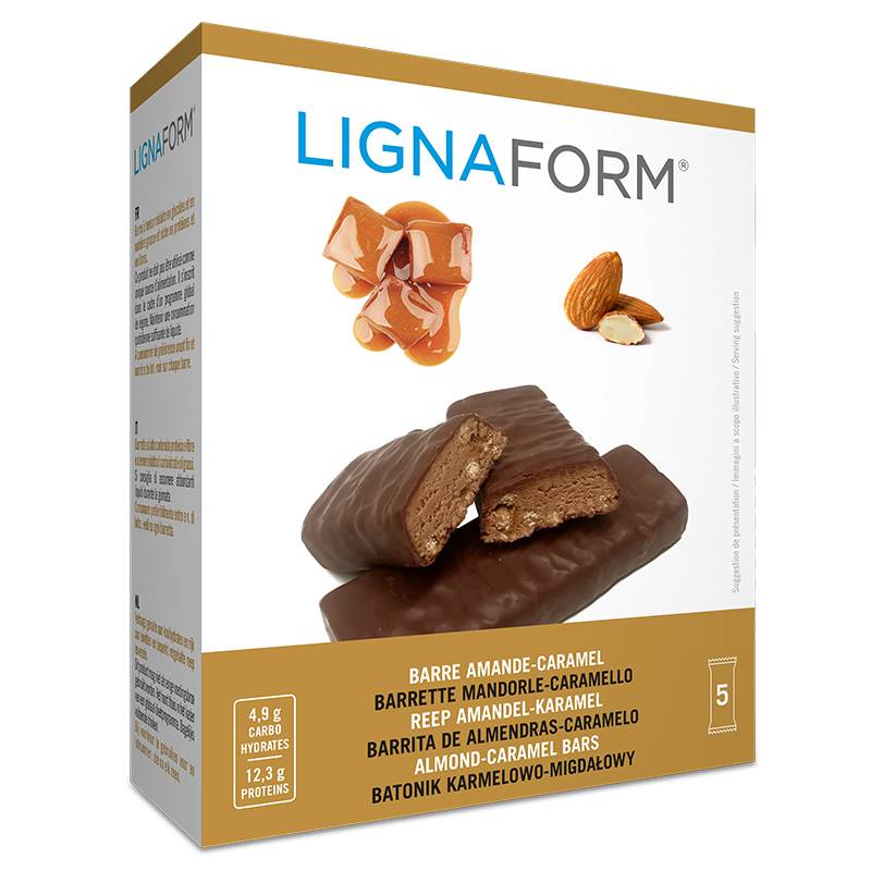 Agent de charge : sirop de polydextrose, protéines de lait, chocolat de couverture au lait 16% (sucre, beurre de cacao, poudre de lait, masse de cacao, émulsifiant : lécithine de soja, arôme naturel de vanille), protéines de blé, sirop d'oligofructose, huile de tournesol, amandes hachées grillées 1,7%, émulsifiant : lécithine de soja, stabilisant : glycérol, poudre de cacao, caramel croquant (sucre, beurre de cacao, amidon de riz, bicarbonate de sodium, arôme naturel), sel.