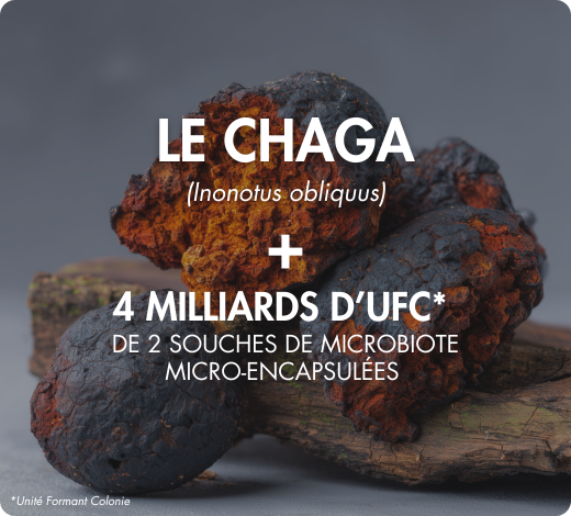 MUSHROOMSSENTIEL® Chaga est une association unique de poudre et d’extrait de sporophore de chaga (partie fructifère, correspondant à la partie visible et active du champignon) issu de l’agriculture biologique, et de 2 souches de microbiote microencapsulées.