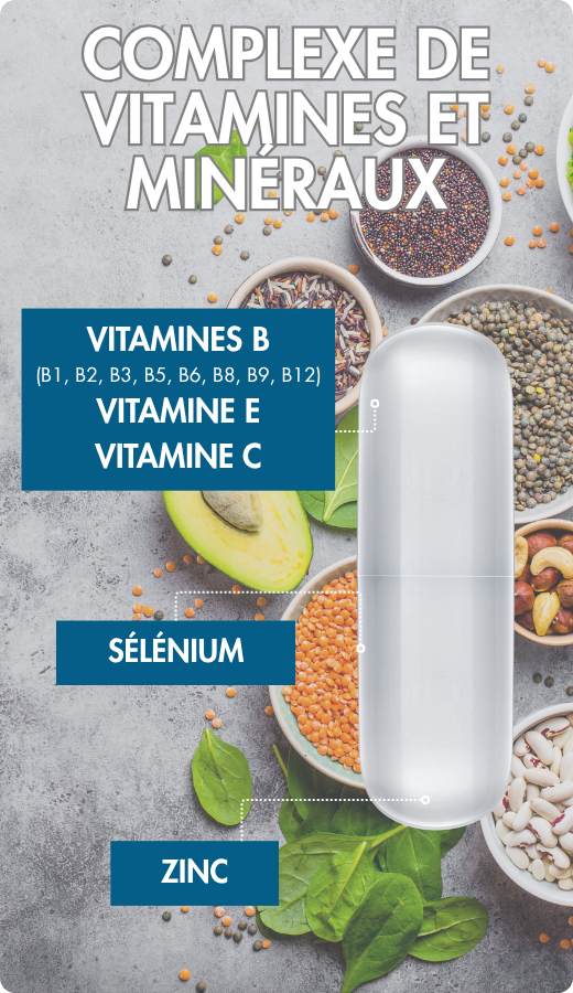 Complexe micronutritionnel déposé par le Laboratoire THERASCIENCE, associant 11 vitamines (B1, B2, B3, B5, B6, B8, B9, B12, C, D3 et E naturelles) et 2 oligo-éléments (zinc et sélénium) sous leurs formes les plus biodisponibles pour une efficacité et une absorption optimales : Vitamines B2, B6, B9 et B12 sous forme coenzymée ; Sélénium sous forme sélénométhionine ; Zinc sous forme bisglycinate