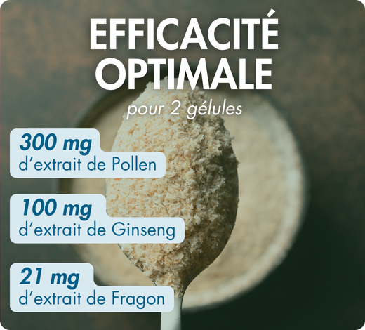Association synergique de 3 bio-actifs (Pollen, Ginseng et Fragon) et du complexe micronutritionnel exclusif Suvimine 13®
