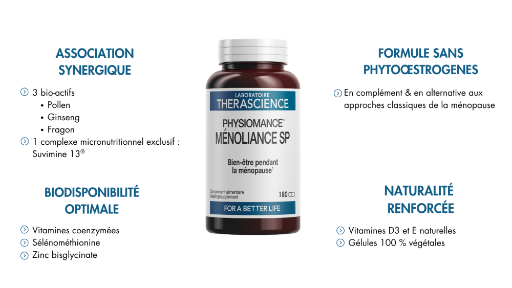 Si le traitement hormonal substitutif (THS) peut représenter une option, il n’est pas toujours prescrit en première intention. Pour les femmes sensibles aux hormones ou pour qui ce traitement n’est pas indiqué, les solutions sans hormones représentent une alternative particulièrement intéressante. Elles permettent d’agir sur les symptômes de la ménopause en ciblant d’autres leviers physiologiques : soutien du métabolisme énergétique, protection contre le stress oxydatif, régulation de l’activité hormonale grâce aux micronutriments, ou encore amélioration du confort circulatoire. C’est précisément le positionnement de PHYSIOMANCE® Ménoliance SP, une formule sans phytoœstrogènes, que ce soit en alternative ou en complément d’autres approches thérapeutiques.