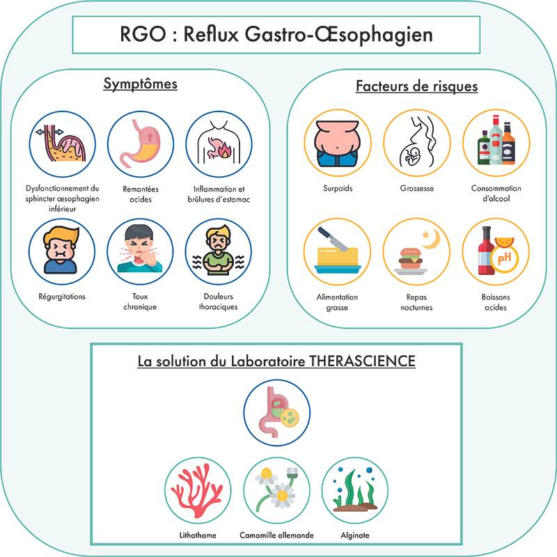 Pour agir efficacement contre le reflux gastro-œsophagien, le Laboratoire THERASCIENCE a développé PHYSIOMANCE RGO / Gastrolox (en Belgique), une association synergique de 2 bio-actifs et 1 bio-polymère aux 4 actions complémentaires au niveau de l’acidité, de l’inflammation, du tonus musculaire et de la protection de l’œsophage.