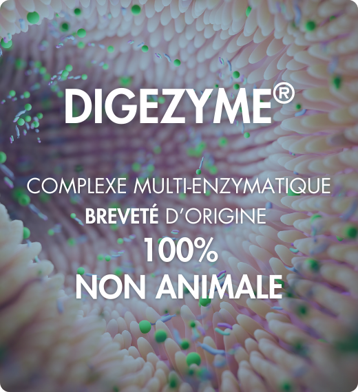 • DigeZyme®: Complexe multi-enzymes breveté d’origine 100 % non-animale à l’efficacité cliniquement démontrée