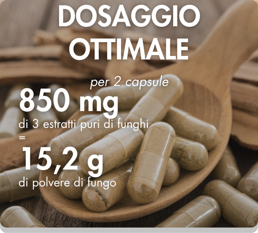 Il nostro estratto standardizzato di Cordyceps (micelio) presenta un rapporto di estrazione elevato di 50:1. Così, 2 capsule di MUSHROOMSSENTIEL® Bio-Brain apportano 200 mg di estratto puro di cordyceps, equivalenti a 10 g di polvere di fungo.