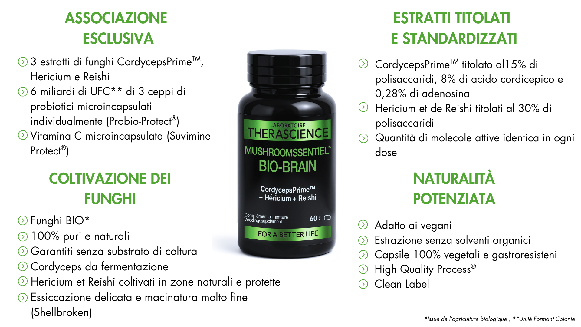 Il Laboratoire THERASCIENCE ha selezionato il Cordyceps BIO CordycepsPrimeTM (ceppo originario CS-4, certificato tramite test del DNA), con proprietà identiche al fungo selvatico e che garantisce una qualità costante. Questo ceppo, ampiamente documentato nella letteratura scientifica, ha dimostrato la sua efficacia attraverso oltre 30 studi clinici.