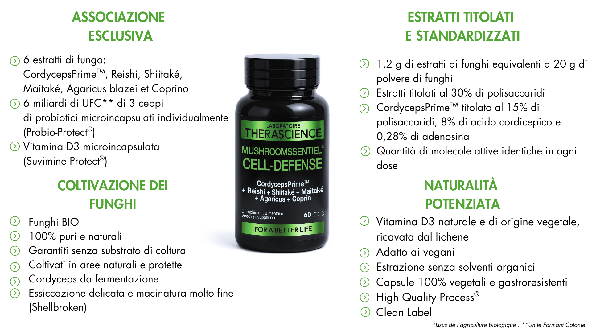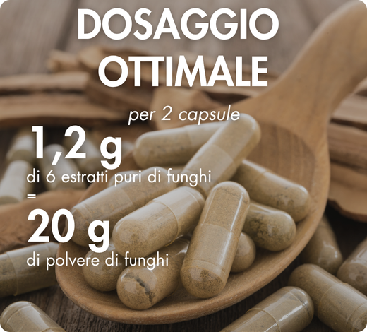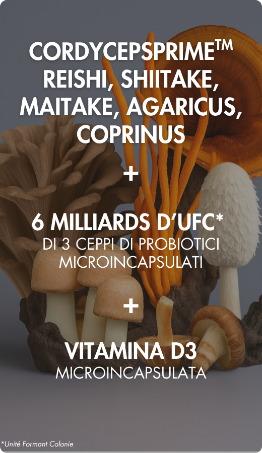 - Associazione unica: 6 estratti di funghi BIO* (Cordyceps CS-4 CordycepsPrimeTM, Reishi, Shiitake, Maitake, Agaricus blazei e Coprinus comatus) + 3 ceppi di probiotici microincapsulati individualmente (Probio-Protect®) e 1000% del CR di vitamina D3 naturale e vegetale microincapsulata (Suvimine Protect®)