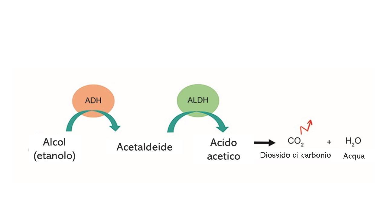 In primo luogo, l'alcol viene elaborato dalla coppia di enzimi ADH (alcol deidrogenasi) / ALDH (aldeide deidrogenasi). L'ADH metabolizza innanzitutto l'alcol (etanolo) in acetaldeide. L'ALDH la converte poi in acido acetico, che viene scomposto in acqua e CO2 prima di essere eliminato attraverso la respirazione. La scarsa espressione di una forma di ALDH, l'ALDH2, in particolare in alcune popolazioni asiatiche, porta all'accumulo di acetaldeide nell'organismo, un fenomeno che può causare danni ancora maggiori.