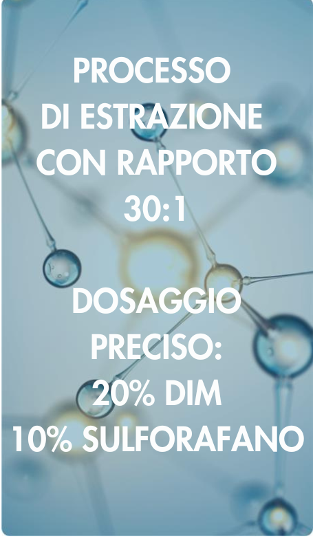 I nostri estratti sono standardizzati per contenere livelli precisi di questi preziosi composti: 20% di DIM, una molecola naturalmente formata durante la digestione delle cruciferi, e 10% di sulforafano.