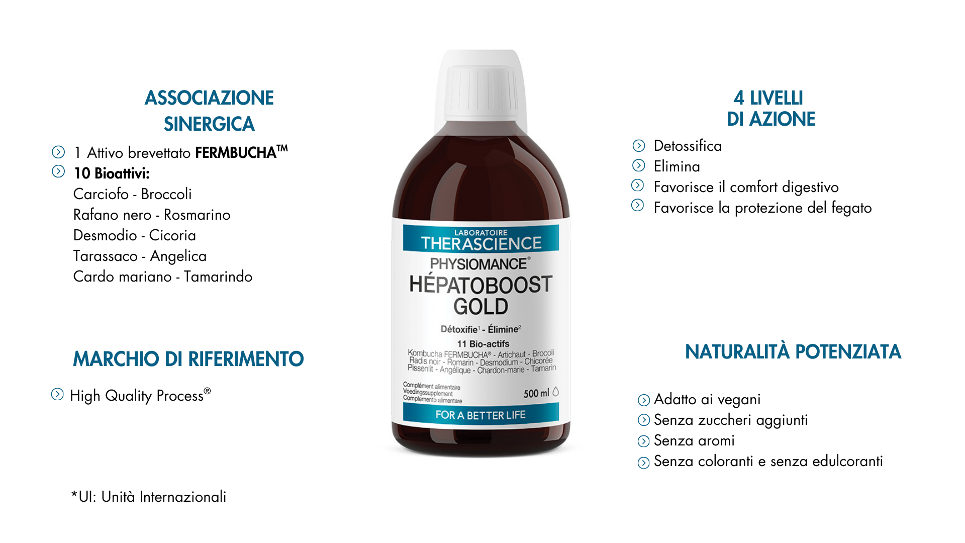 PHYSIOMANCE® Hépatoboost Gold contiene FermbuchaTM, una polvere di kombucha ottenuta da un processo brevettato e controllato di fermentazione del tè nero biologico, ricca di polifenoli e standardizzata nei metaboliti chiave coinvolti nella disintossicazione epatica: acido glucuronico (GlcUA) e acido D-saccarico-1,4-lattone (DSL). Nell'ambito di un approccio orientato alla qualità, PHYSIOMANCE® Hépatoboost Gold è formulato senza nanoparticelle, senza coloranti, senza ingredienti a base di lattosio o glutine ed è adatto a persone che seguono una dieta vegana.