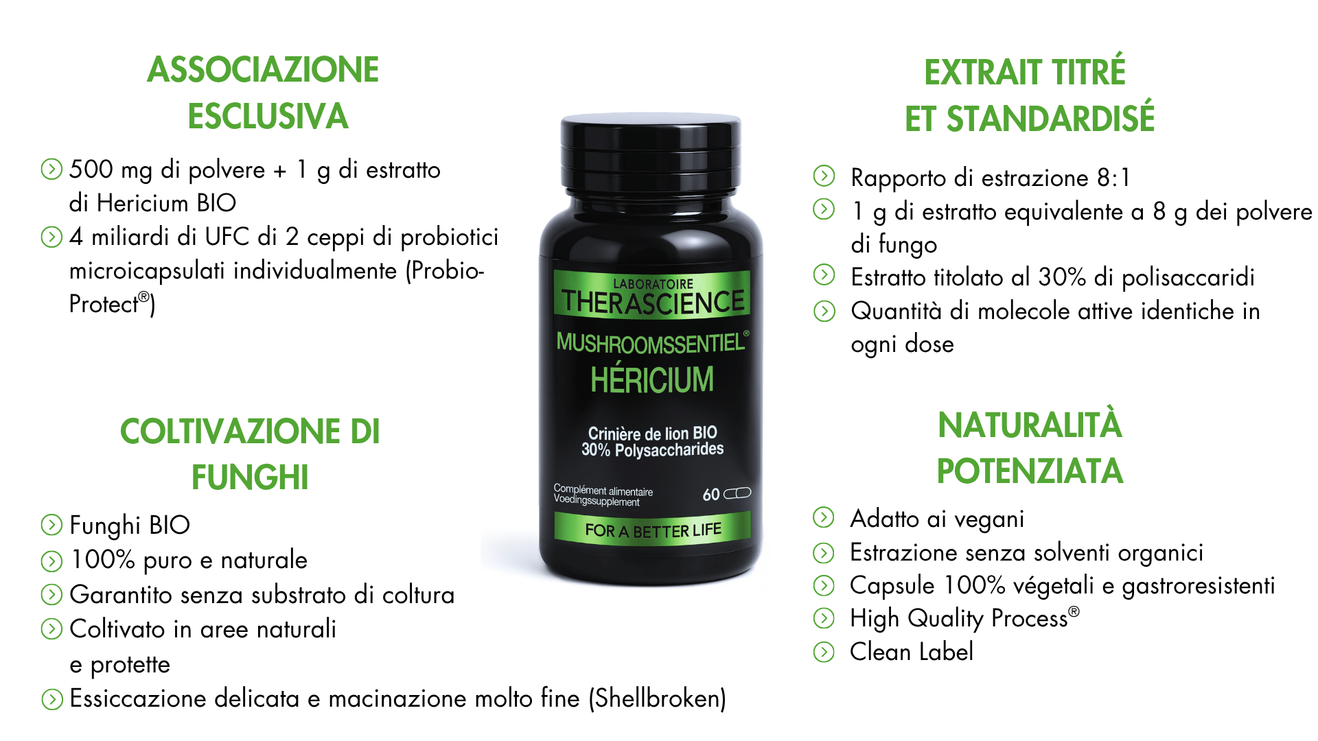MUSHROOMSSENTIEL® Héricium associa la polvere di hericium, con il suo estratto titolato in molecole attive, suguendo un approccio sinergico al tempo stesso completo e ottimizzato. Ogni componente apporta benefici specifici e complementari.