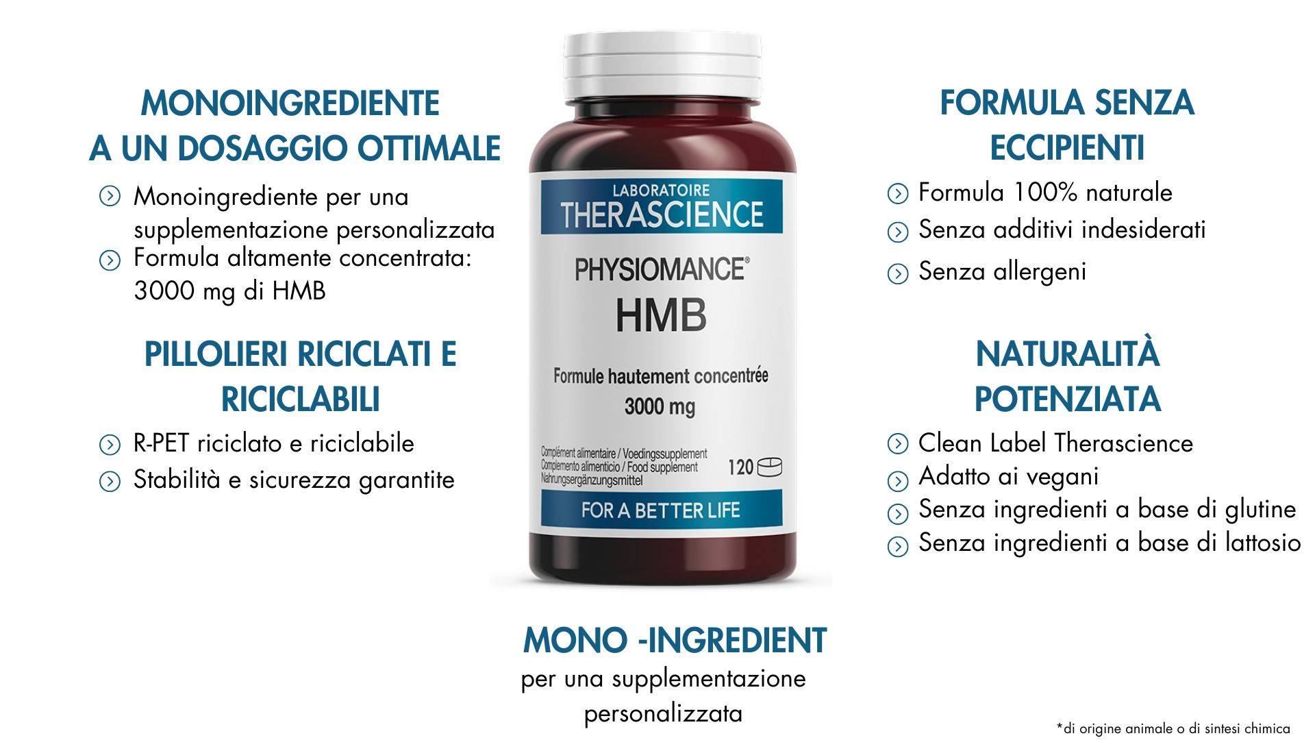 I nostri prodotti sono sviluppati con un'autentica attenzione alla qualità e all'efficacia degli ingredienti attivi! Scegli il meglio con PHYSIOMANCE® HMB, une formula naturale rispettosa del Clean label® THERASCIENCE! Con questo label ci impegniamo a fornire formule naturali, dalla scelta dei composti attivi agli eccipienti, senza coloranti o aromi artificiali, senza aspartame, senza biossido di titanio, senza OGM, senza nanoparticelle, non irradiate, senza silice colloidale, senza conservanti, non testate su animali e prodotte in Europa. PHYSIOMANCE® HMB è inoltre privo di lattosio e di glutine..