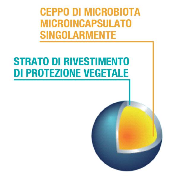 Ogni ceppo è microincapsulato individualmente in uno strato di rivestimento di origine vegetale, appositamente progettato per consentire il rilascio di attivi nell'intestino e quindi: