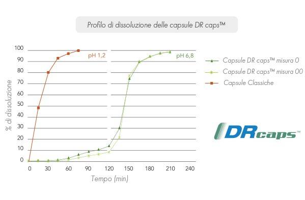 Contrariamente alle capsule convenzionali, le DR caps™ di origine vegetale sono totalmente gastroresistenti al pH acido. Si sciolgono nell'intestino, liberando i ceppi di fermenti lattici.