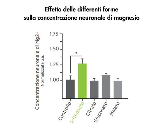 Il magnesio è un minerale essenziale che svolge un ruolo fondamentale per il sistema nervoso e le funzioni psicologiche. Per agire direttamente sul cervello, il magnesio deve attraversare la barriera emato-encefalica (BEE). Questa capacità dipende dalla forma del magnesio e dai meccanismi di trasporto attivi coinvolti. Il magnesio L-treonato brevettato Magtein® è una forma appositamente studiata per rispondere a questa problematica. In questa forma, l'L-treonato svolge il ruolo di trasportatore del magnesio. L'L-treonato è un derivato della vitamina C, naturalmente presente nel cervello e nel liquido cerebrospinale. Per facilitare la diffusione del magnesio nelle cellule, l'L-treonato utilizza i trasportatori GLUT, particolarmente abbondanti a livello della BEE. Inoltre, il magnesio L-treonato brevettato Magtein® è il magnesio di riferimento con efficacia clinicamente provata sulle prestazioni intellettuali e sulla funzione cognitiva, oggetto di numerosi studi scientifici e la cui assimilazione eccezionale a livello cerebrale consente di aumentare significativamente la concentrazione neuronale di magnesio.