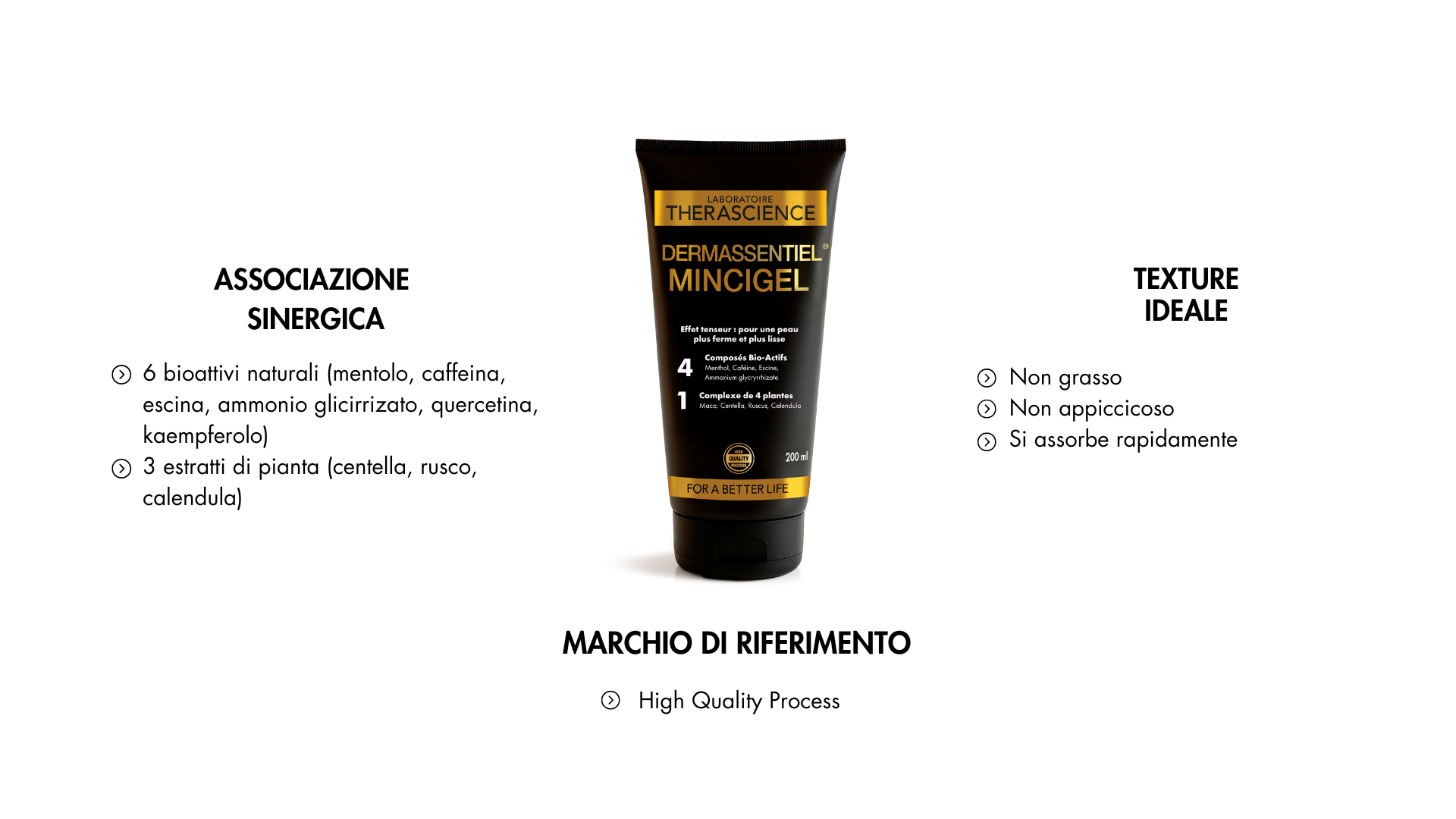 DERMASSENTIEL® Mincigel eÈ una formula innovativa che combina 6 bioattivi potenti (Mentolo, Caffeina, Escina, Glicirrizato di ammonio, Quercetina, Kaempferolo) e un complesso di 3 estratti vegetali (Centella – Rusco – Calendula) selezionati per i loro effetti complementari.