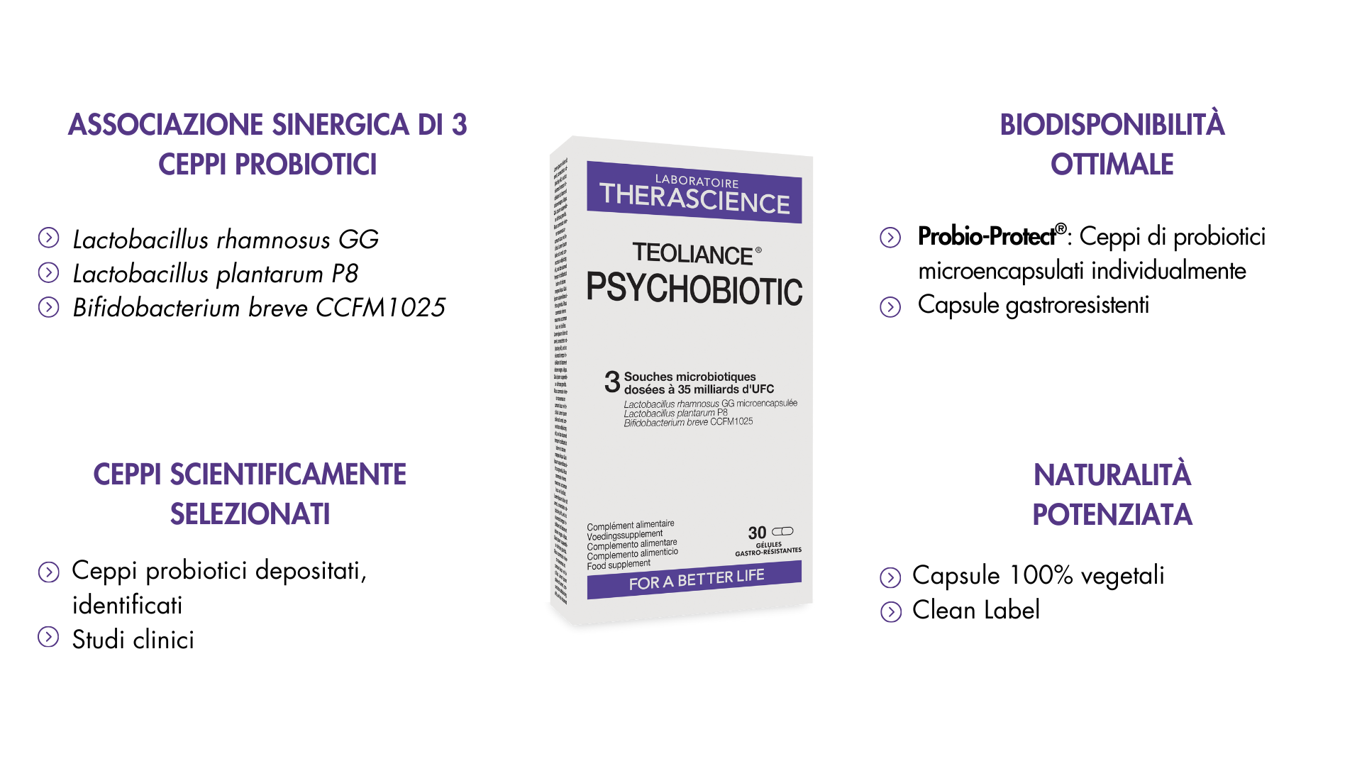 TEOLIANCE® Psychobiotic integra inoltre la tecnologia brevettata Probio-Protect®, un processo di microincapsulazione individuale dei ceppi sviluppato dal Laboratoire THERASCIENCE. Ogni ceppo microbiotico è protetto da uno strato di rivestimento di origine vegetale, specificamente progettato per accompagnarne la liberazione nell’intestino. Questa microincapsulazione individuale mira a preservare la qualità dei ceppi durante il processo di incapsulazione, proteggerli da fattori ambientali come ossidazione, luce, calore o umidità e a evitare interazioni premature tra i componenti della formula.