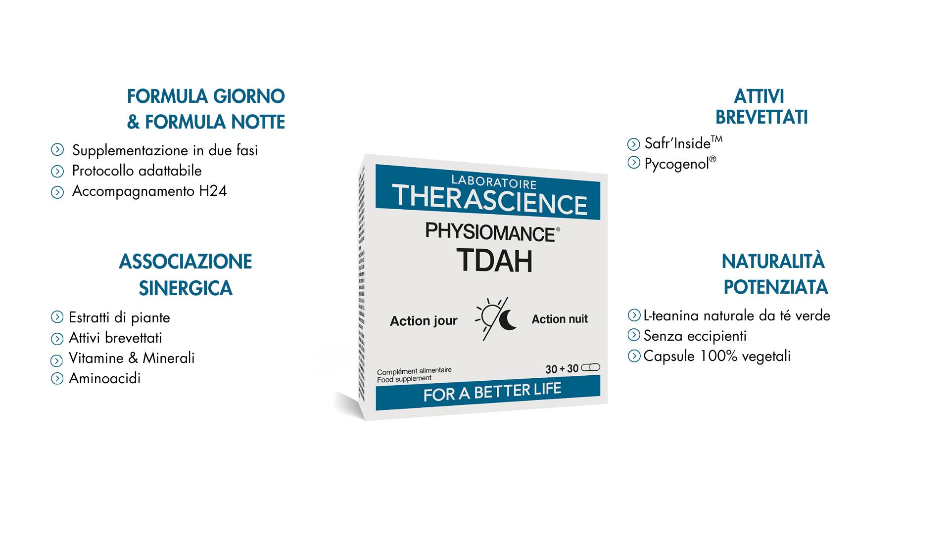 La formula NOTTE di PHYSIOMANCE® TDAH è stata concepita per accompagnare la fine della giornata, quando l’iperattivazione dei circuiti attentivi ed emotivi rende complessa la transizione verso uno stato di calma. Associa un estratto di pino marittimo, il Pycnogenol®, l’estratto di zafferano Safr’Inside™, L-triptofano, nonché un insieme completo di vitamine del gruppo B (B1, B2, B3, B5, B6, B8, B9, B12), vitamina D e i minerali ferro e zinco.
