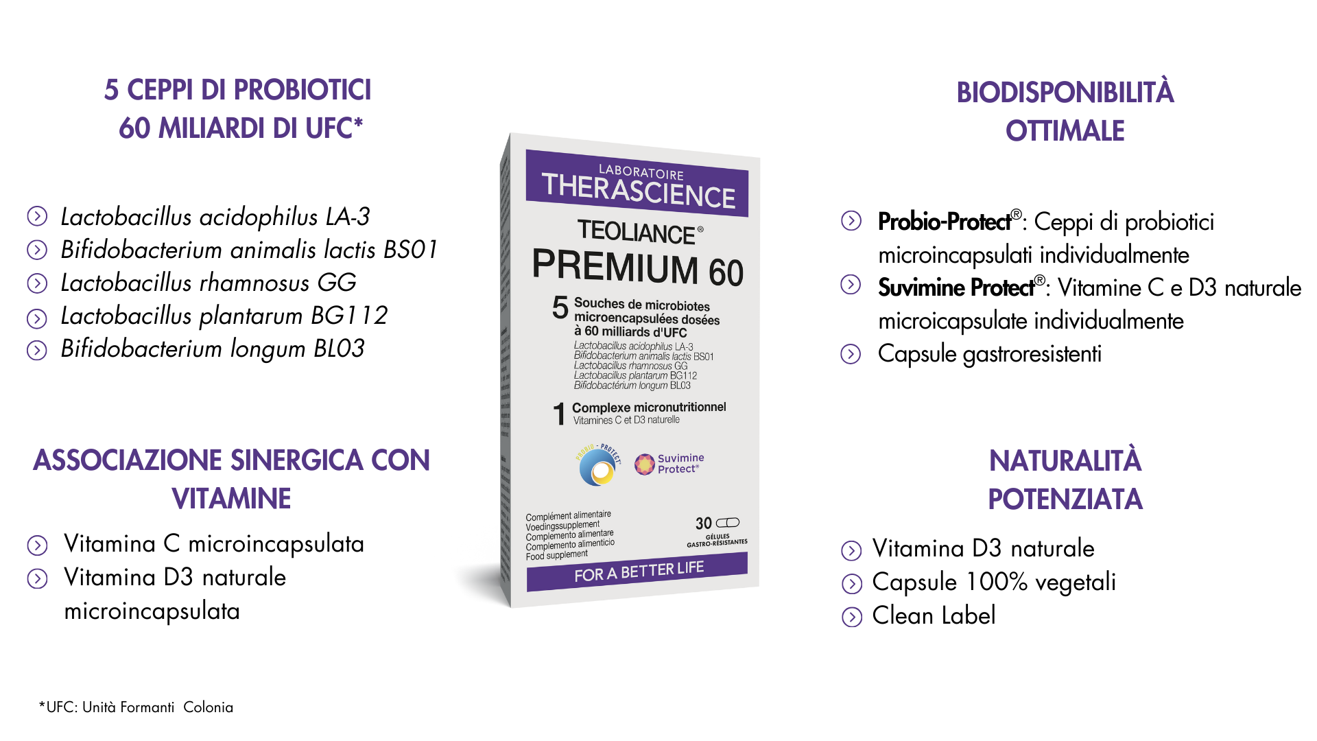 Grazie a questa associazione di capsule gastroresistenti, di microincapsulazione Probio-Protect® dei ceppi e di microincapsulazione Suvimine Protect® delle vitamine, TEOLIANCE® Premium 60 è il risultato di una formulazione rigorosa, che garantisce biodisponibilità ottimale, stabilità dei componenti e piena coerenza tecnologica, offrendo un integratore a base di ceppi di probiotici sviluppato secondo i più elevati standard di qualità e tracciabilità.