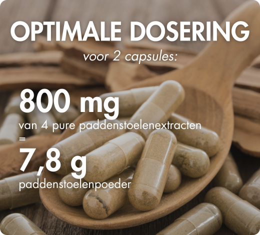 Zo leveren 2 capsules MUSHROOMSSENTIEL® Bio-Immu 800 mg van 4 pure paddenstoelenextracten, wat overeenkomt met 7,8 g paddenstoelenpoeder. Elke dagelijkse dosis levert 240 mg polysacchariden, wat een sterk geconcentreerde formule garandeert.