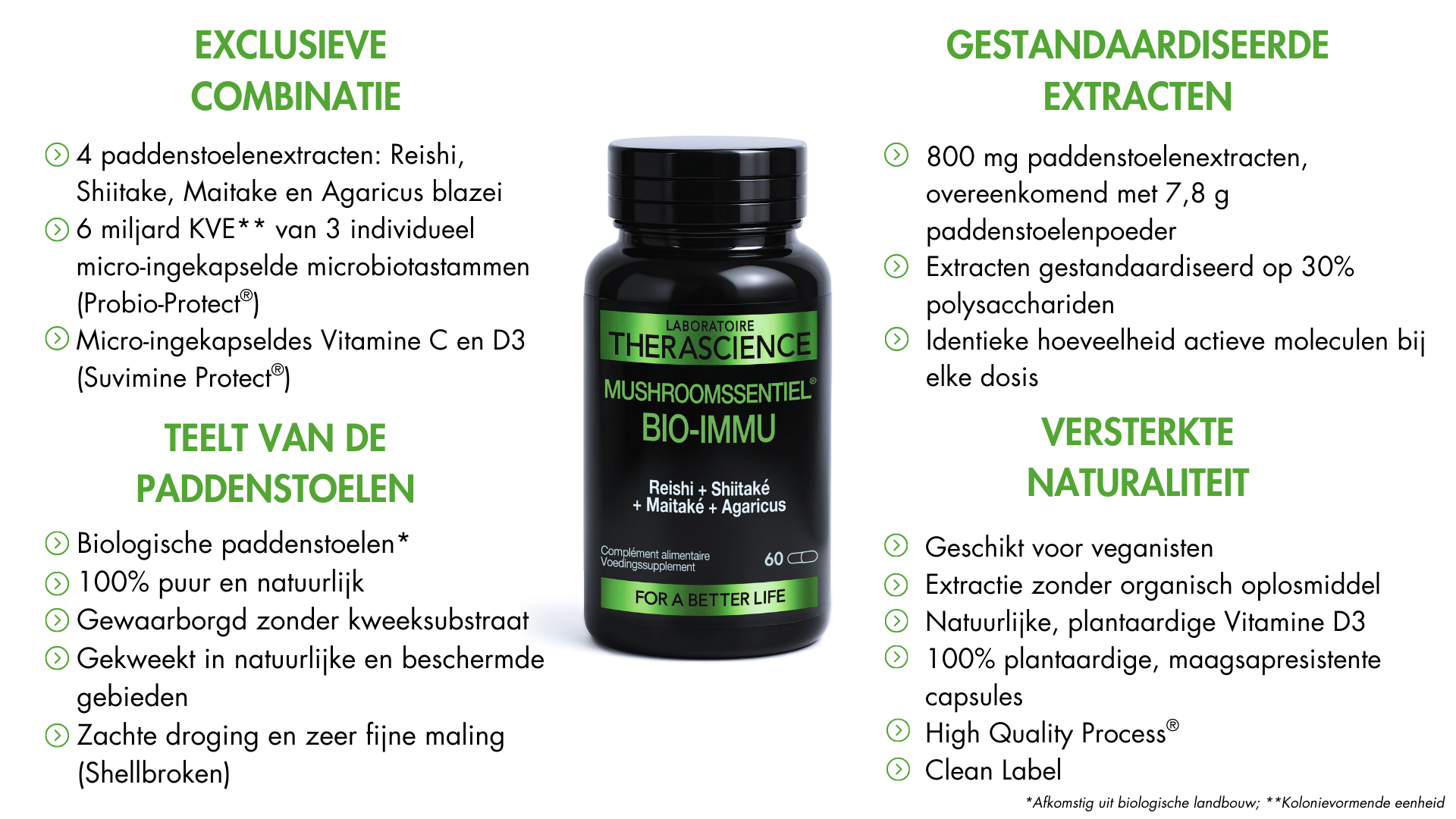 Het Laboratorium THERASCIENCE heeft gestandaardiseerde extracten geselecteerd van Reishi, Shiitake, Maitake en Agaricus blazei om een constante kwaliteit te waarborgen, dankzij een rigoureus productieproces dat een nauwkeurige dosering van actieve moleculen garandeert. Deze standaardisatie verzekert een optimale doeltreffendheid, een essentiële voorwaarde voor een hoogwaardig voedingssupplement.