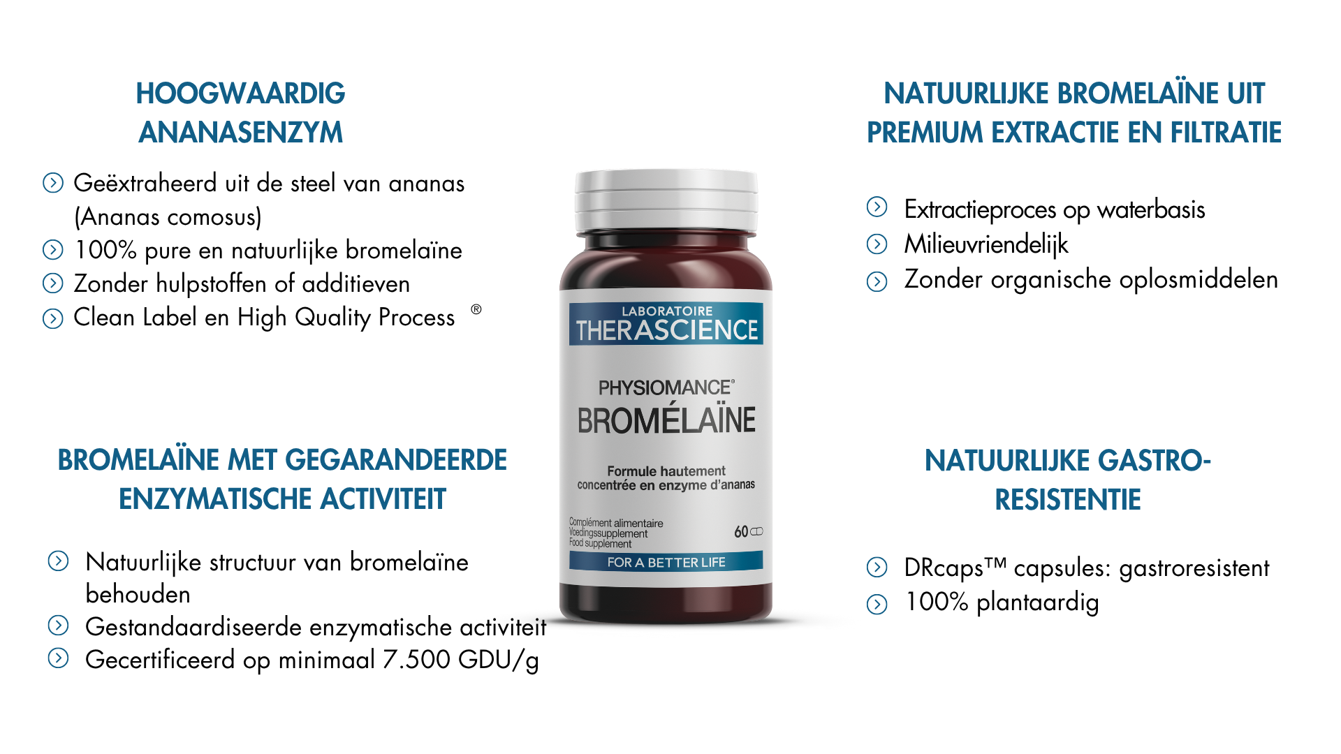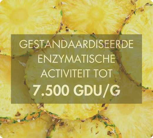 - Bromelaïne van natuurlijke en plantaardige oorsprong, stoom geëxtraheerd zonder toevoegingen;
