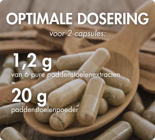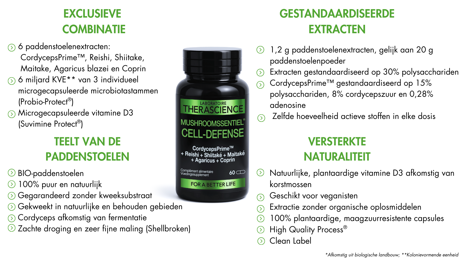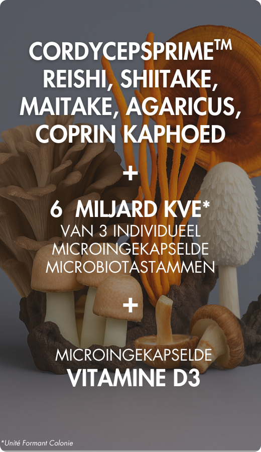 - Unieke combinatie: 6 BIO-paddenstoelenextracten* (Cordyceps CS-4 CordycepsPrimeTM, Reishi, Shiitaké, Maitaké, Agaricus blazei en Haarbekercoprin) + 3 individueel microgeëncapsuleerde microbiotastammen (Probio-Protect®) en 1000% van de ADH aan natuurlijke en plantaardige microgeëncapsuleerde vitamine D3 (Suvimine Protect®)