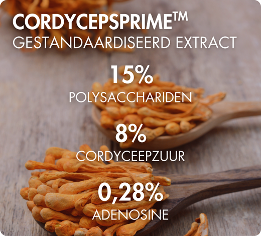 - CordycepsPrimeTM: Geregistreerd myceliumextract van natuurlijk Cordyceps sinensis CS-4 afkomstig van fermentatie, gestandaardiseerd op 15% polysacchariden, 8% cordycepszuur en 0,28% adenosine, met klinisch bewezen effectiviteit