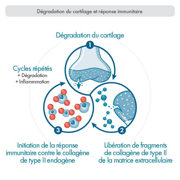De kraakbeenbeschadiging vertoont geen regressie en de artrose kan snel toenemen. Naast de leeftijd spelen vele factoren een rol bij de ontwikkeling van artrose, waaronder overmatige druk op de gewrichten in geval van overgewicht. Bovendien kan de belasting van de gewrichten tijdens de dagelijkse activiteiten, maar ook tijdens intense sportactiviteiten, schade toebrengen aan het kraakbeen door de fragmentatie van de collageennetwerken.