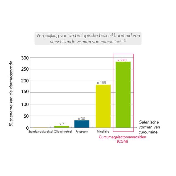 In deze vorm is curcumine 270 keer meer biobeschikbaar dan een standaardextract dat getitreerd is op 95% curcumine, de hoogste biobeschikbaarheid op de markt. Bovendien maakt deze inkapseling curcumine chronoactief gedurende 24 uur en laat het de doorgang van de bloed-hersenbarrière toe.